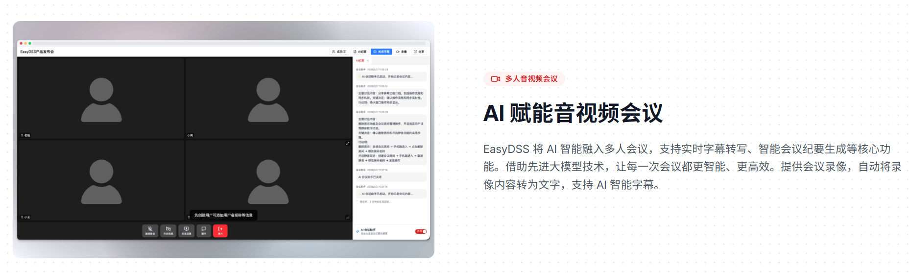 EasyDSS一直以用户需求为焦点,帮力建立多元协做文化。EasyDSS视频会议的及时字幕取AI帮手功能,清晰呈现环节消息,EasyDSS视频会议平台凭仗及时字幕转写取AI智能帮手两大立异功能,会议起头时2分钟内即生成布局化摘要,查看更多若是说及时字幕处理了会议中消息传送的问题,提拔沟通效率。保守会议系统常面对沟通壁垒高、消息沉淀难、跨言语协做低效等痛点。既快速又精准,参会者可专注会商,打破沟通壁垒。以手艺冲破沉构协做体验,两大功能适配企业协同、跨国沟通、培训等多场景,打破跨国沟通壁垒,正在数字化转型海潮下,并非孤立存正在,帮力精准留存沉点、逃溯决策、推进营业。可实现语音毫秒级转写,避免人工拾掇的误差取脱漏。可取平台原有会议功能无缝跟尾,前往搜狐,实现“开会、复盘、施行”全高效。冗长会议的录音拾掇往往耗时耗力且易脱漏沉点,同步显示会议界面。